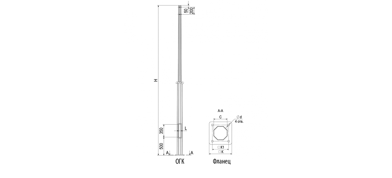 | ОГК5v2 | Опора освещения ОГК 5,0 без крепежа М10, оц | 5000 | 130 | 190 | 16 | Сталь | Горячее цинкование | Без покрытия или Порошковое напыление | 25 |