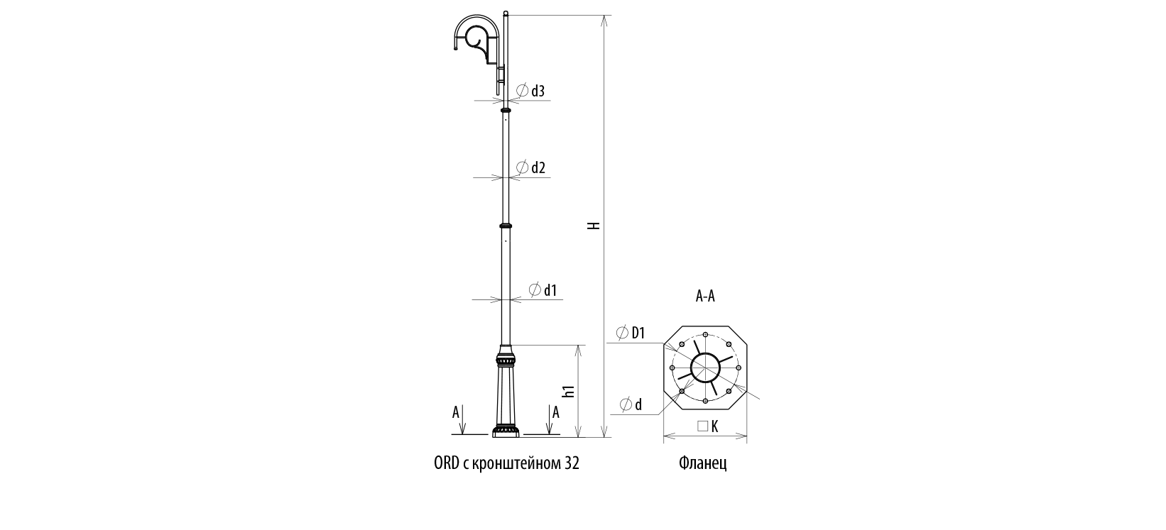 Ствол опор ORD состоит из трех отрезков стальных труб различного диаметра и представляет собой ступенчатую конструкцию. Переходы труб закрываются декоративным чугунным элементом.