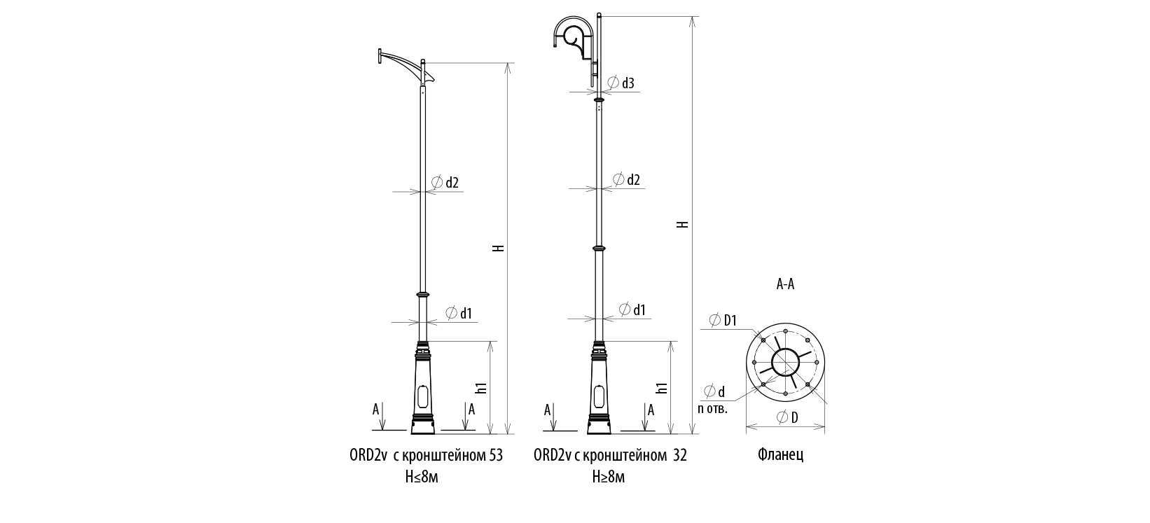 Ствол опор ORD2v состоит из двух отрезков стальных труб различного диаметра и представляет собой ступенчатую конструкцию. Переходы труб закрываются декоративным чугунным элементом.