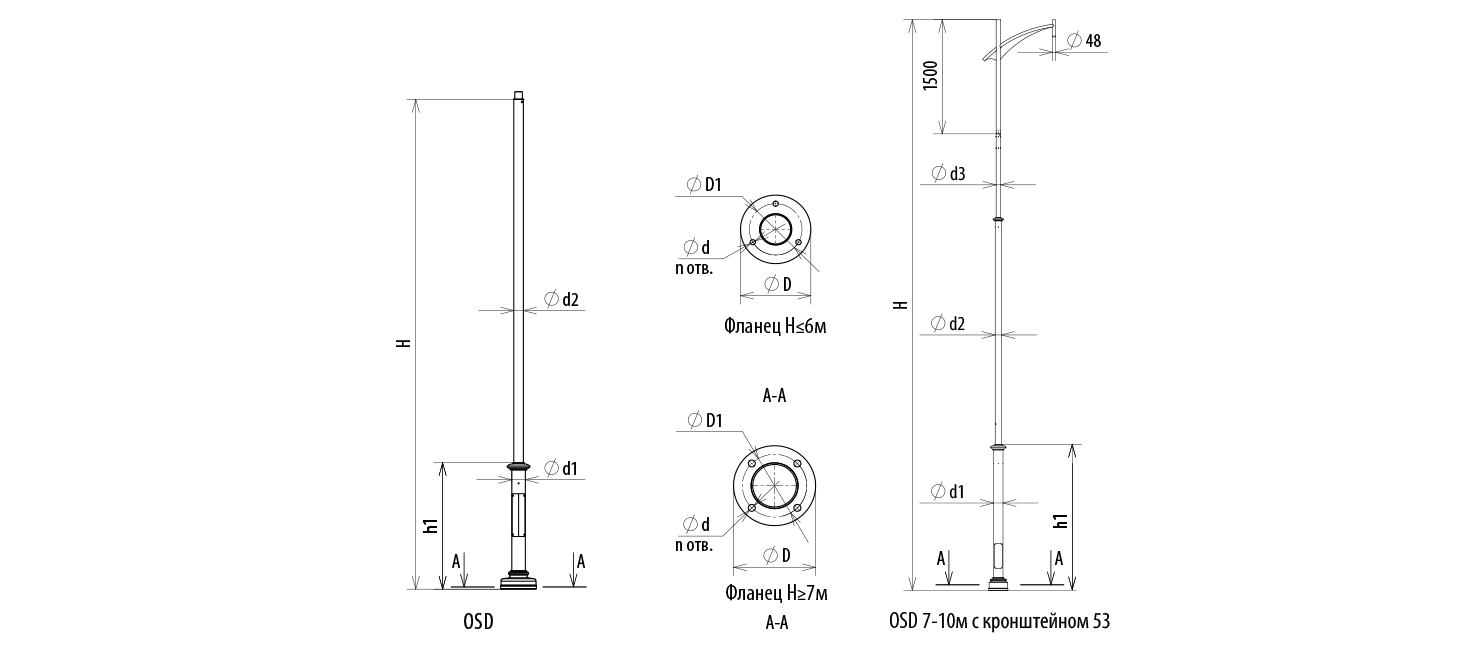 Декоративные фланцевые опоры OSD, выполненные на основе стали и чугунных элементов, применяются для уличного функционального и декоративного освещения. Высокая антивандальность позволяет применять их в местах с очень активным движением людей.