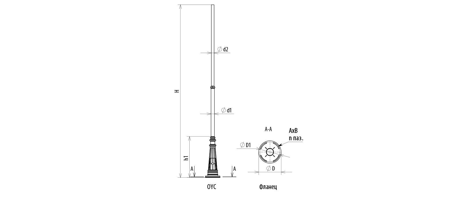 Основным отличием конструкции опор OТС от других опор освещения является декоративное основание-тумба из сплава алюминия. Этот металл легок, абсолютно устойчив к коррозии, достаточно прочен и идеально подходит для фигурного литья. Для крепления к подземным опорам и фундаментам, нижняя часть тумбы представляет собой опорный фланец с четырьмя отверстиями. Чуть выше находится технологическая полость с клеммной коробкой для монтажа электрических соединений.