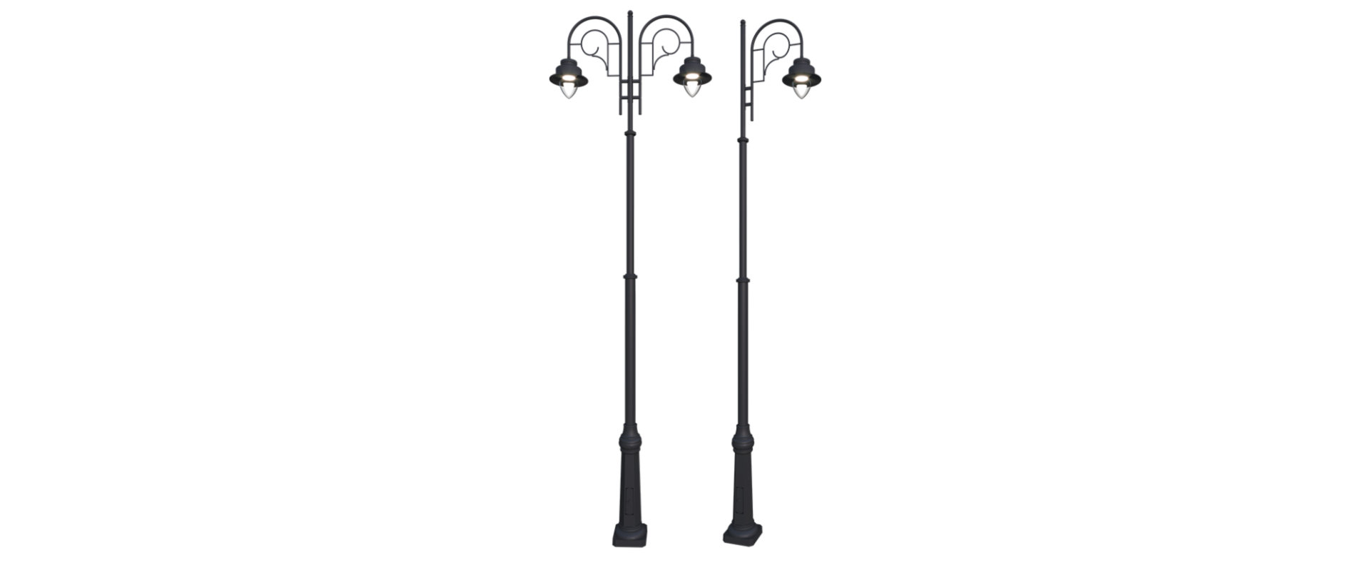 Опоры высотой 8 - 10 метров позволяют применять светильники с лампами ДНаТ, МГЛ до 250 Вт и светодиодные источники света до 200 Вт. На одной опоре может быть от 1 до 5 венчающих или 4 направленных вниз светильников. Для венчающего светильника возможна индивидуальная установка источника питания с поддержкой беспроводной системы управления по протоколу DALI.